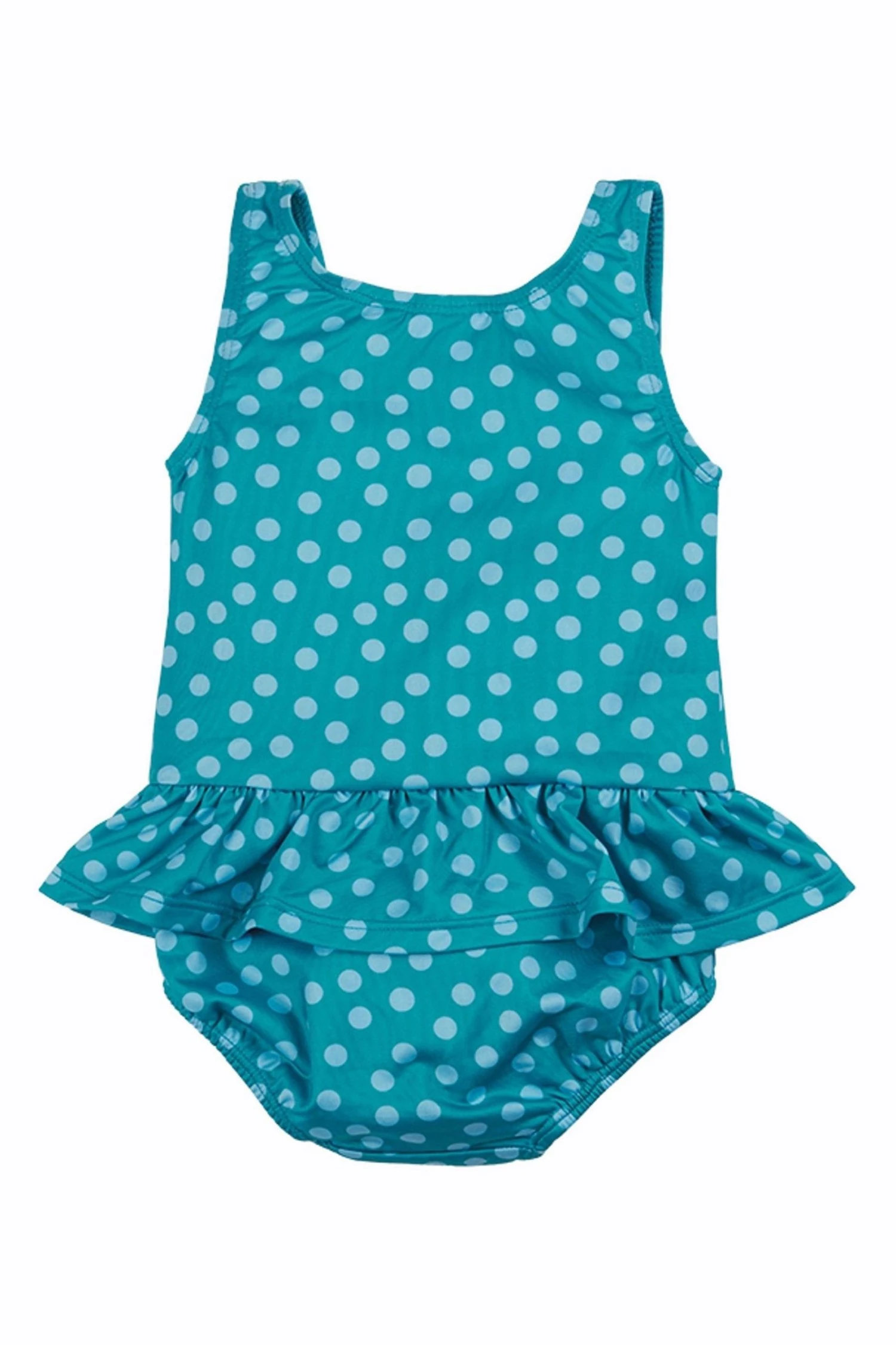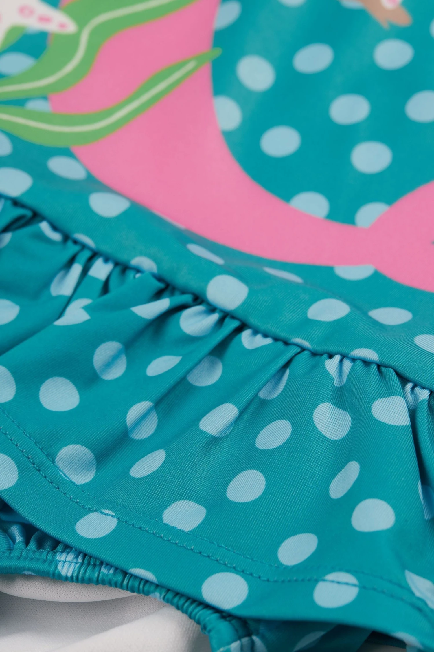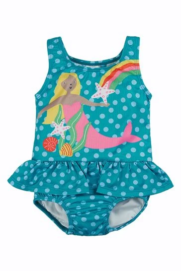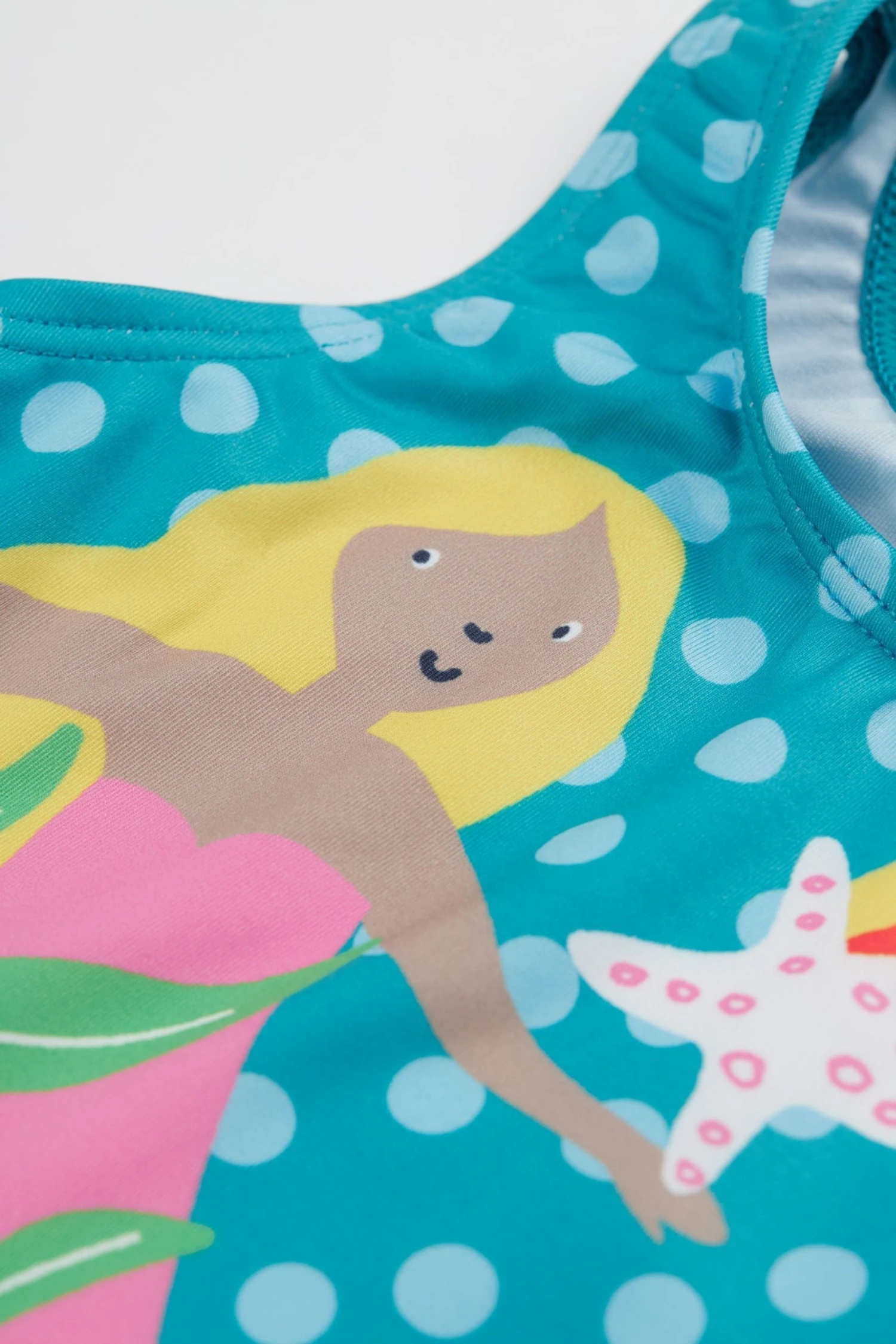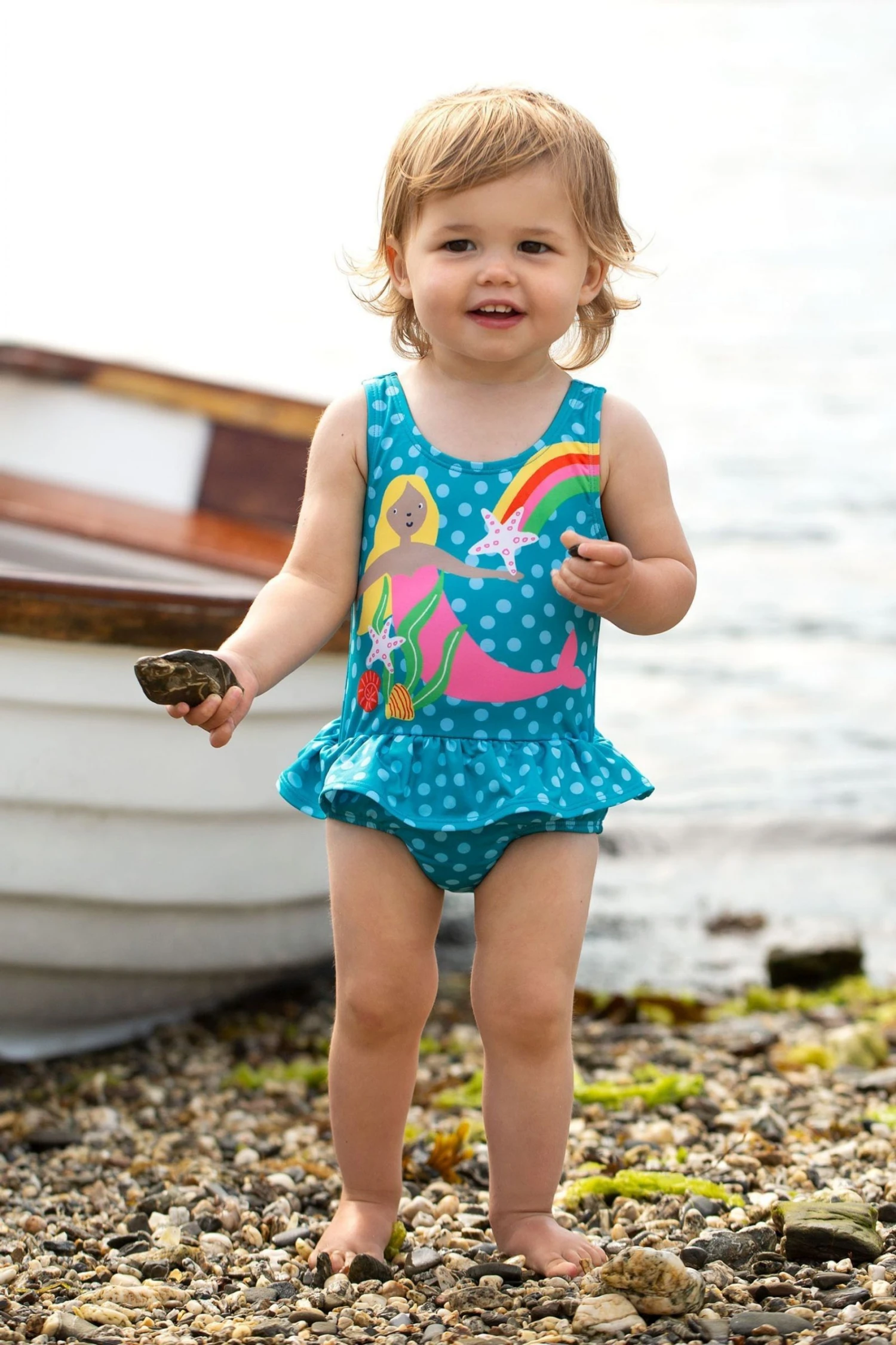A Frugi favourite! A Sea Blue swimsuit made with recycled material that meets UPF 50+ standard. Features soft lining for extra comfort and a mermaid design. Chlorine safe colours and prints.
