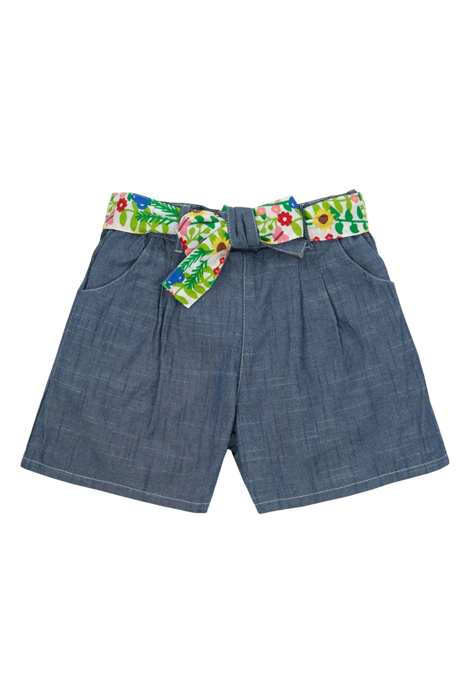 Two looks in one! Inspired by Allotment florals one side of these reversible woven shorts is full of colour and happy sunflowers, the other is a beautiful soft blue chambray. The functional belt ensures a comfortable fit and also reverses to add contrast.