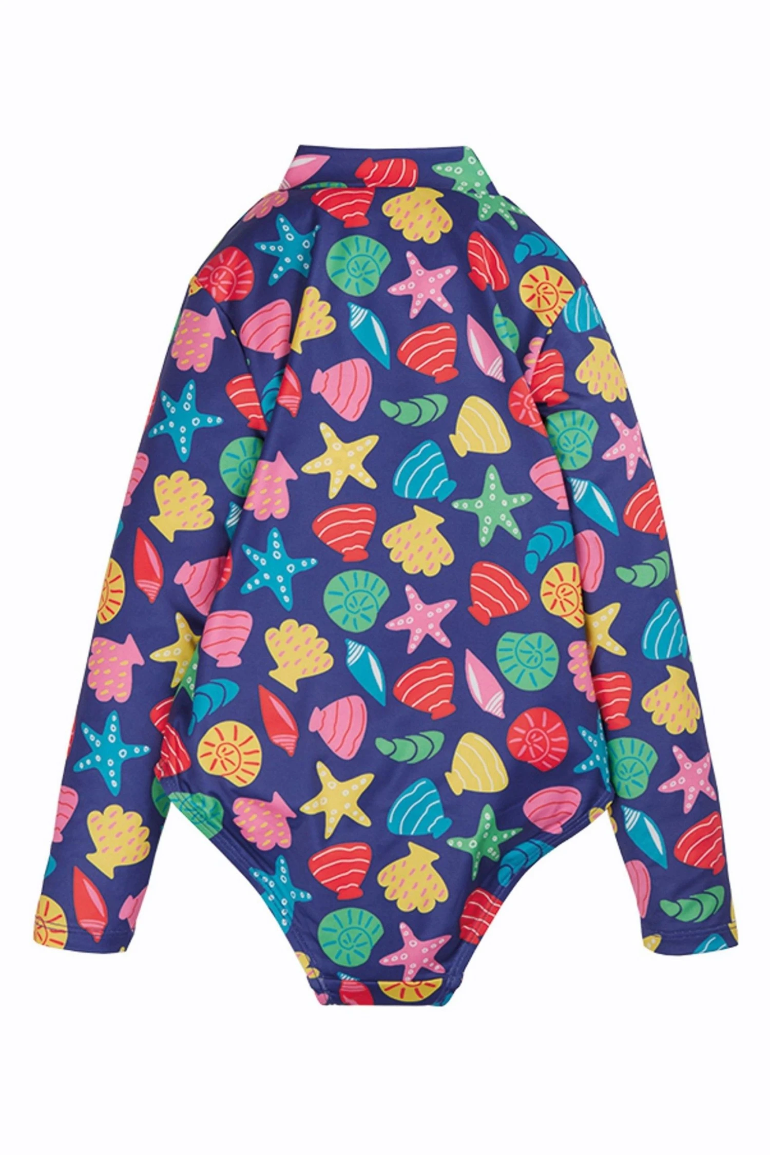 A Frugi favourite! Long sleeved swimsuit made with recycled material that meets UPF 50+ standard. Features front zip fastening for easy peasy dressing. Made with chlorine safe colours and prints.