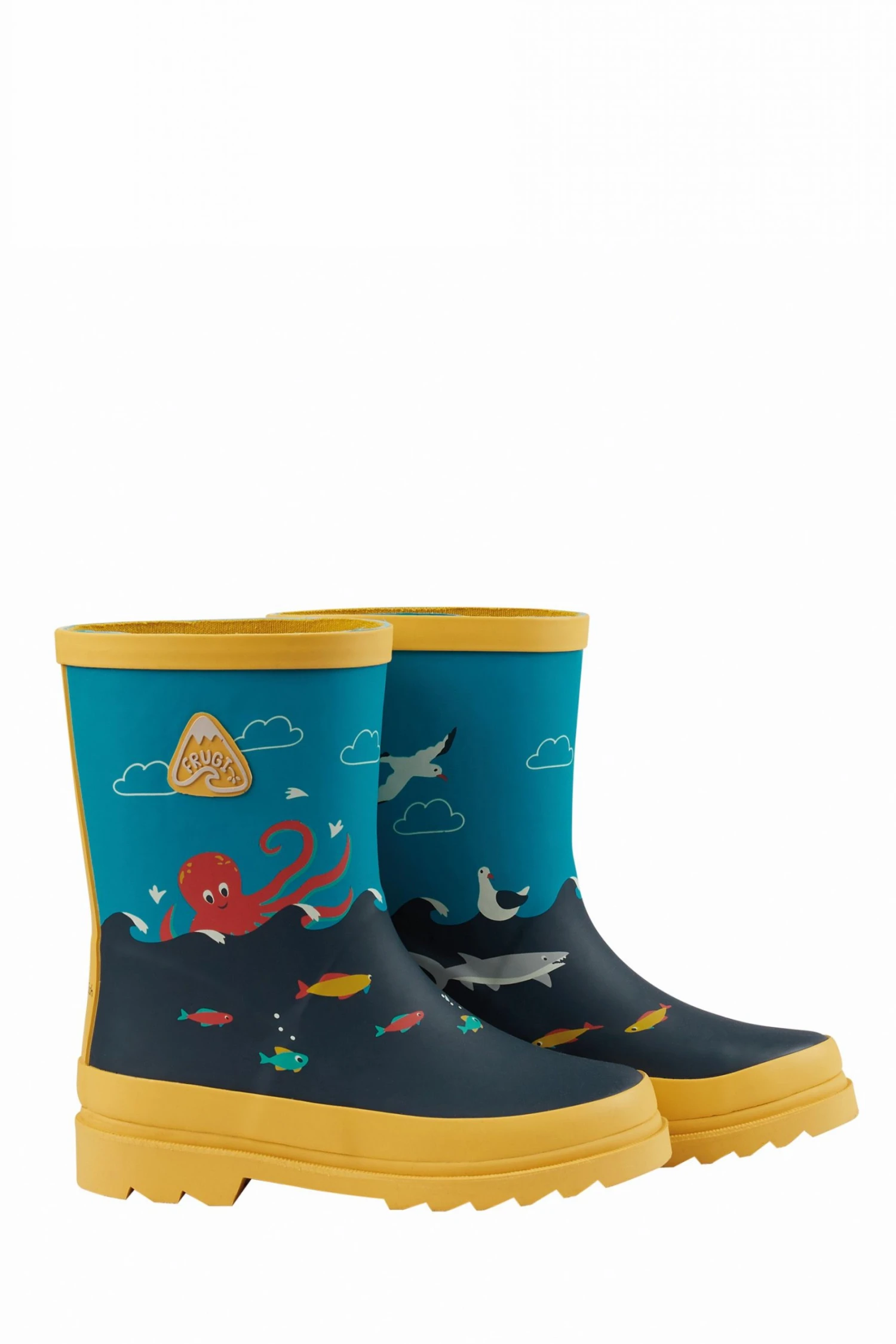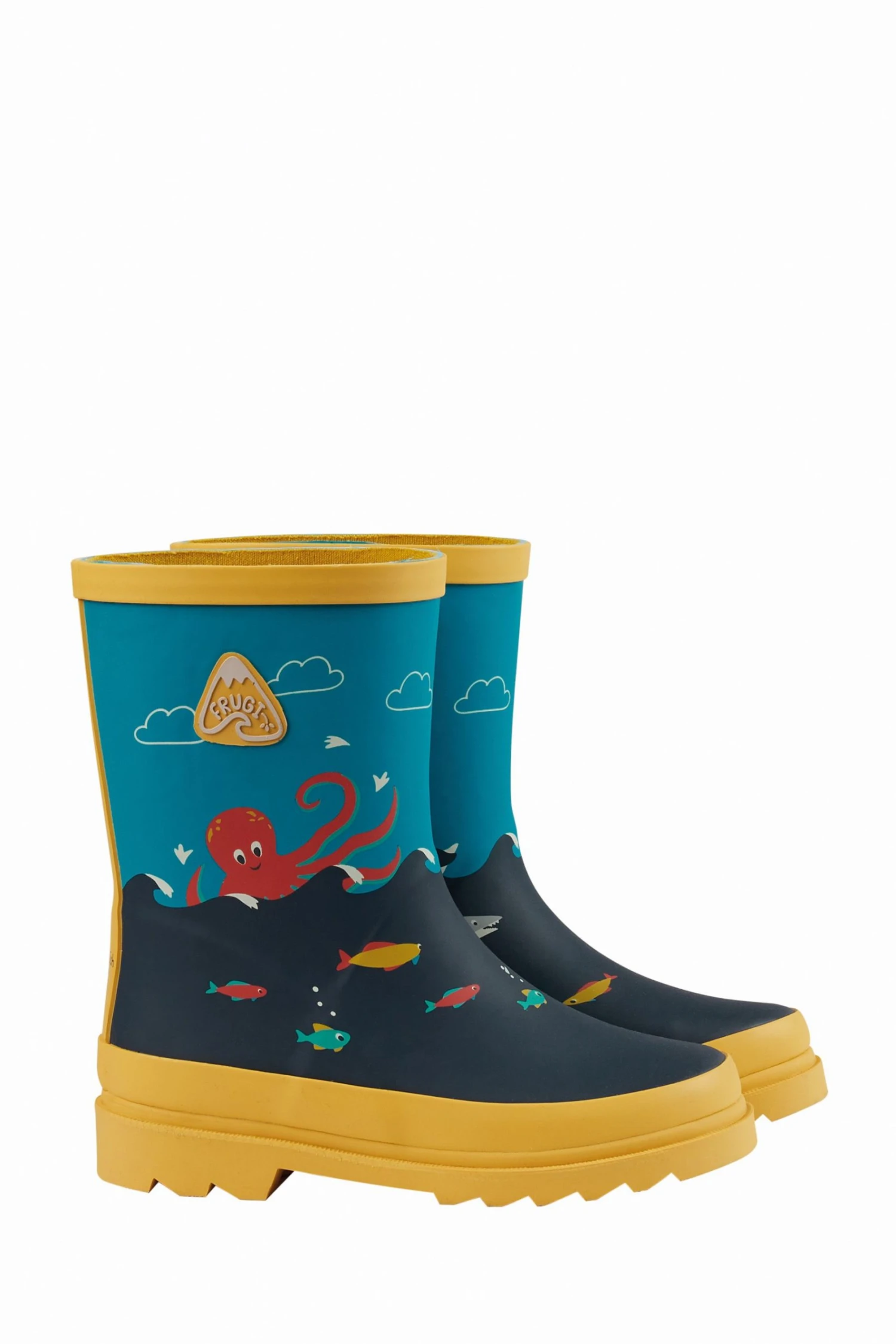 Designed to be slightly slimmer fitting, these soft, flexible wellies are made from natural rubber and are PVC free. Pattern ties in with the Frugi Outerwear range. Cleated sole for extra grip.