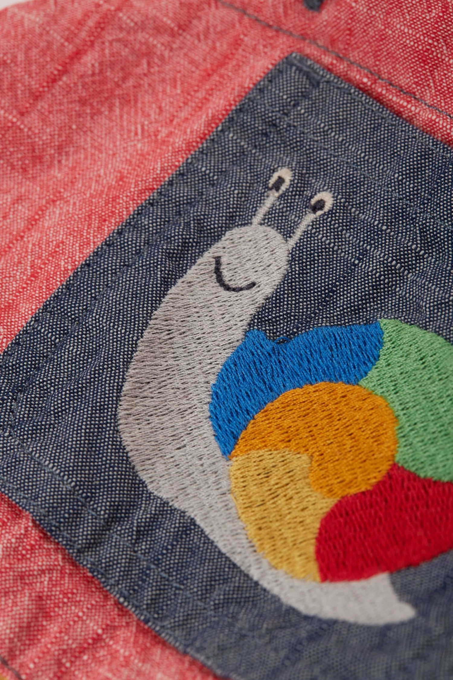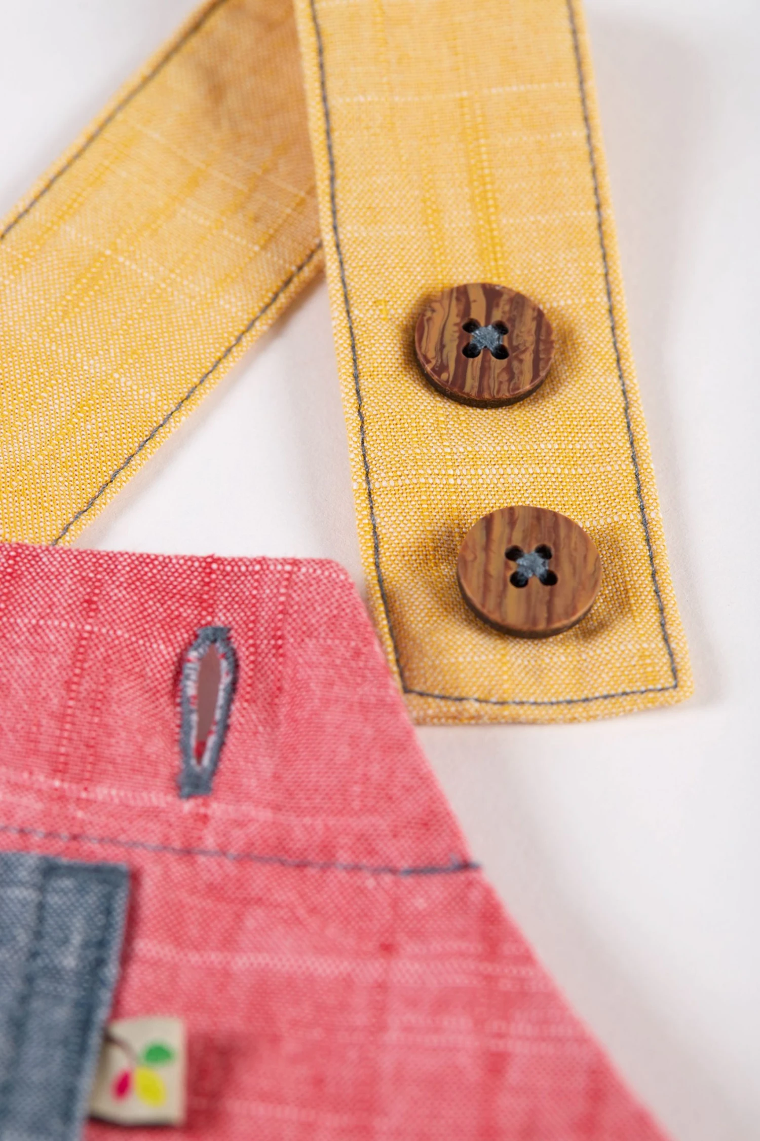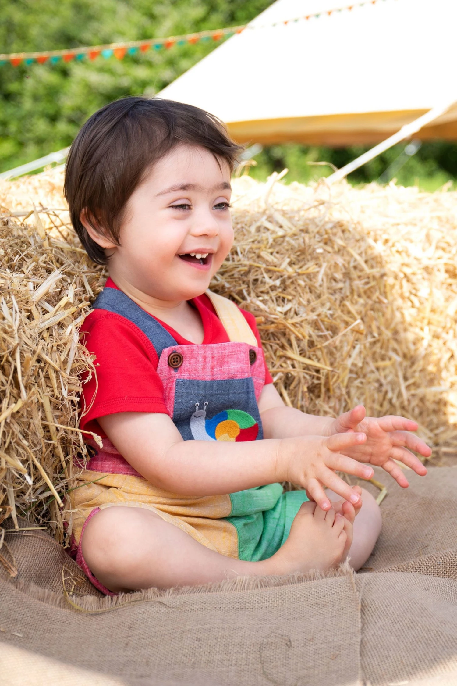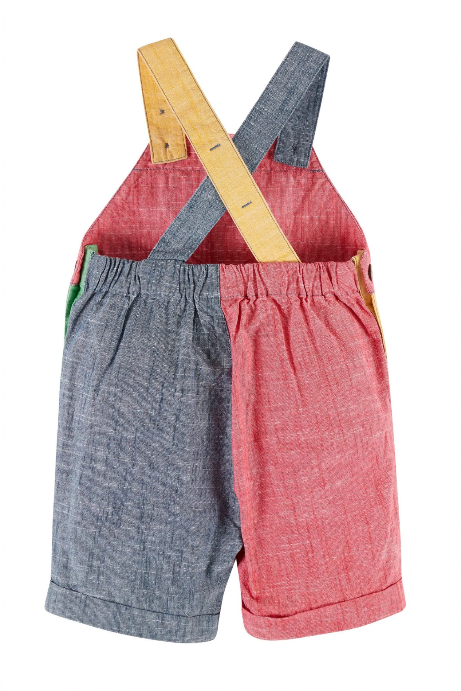 Fun colourblocked short dungarees in soft organic slub chambray, features an applique pocket and adjustable button fastening shoulder straps. Made from 100% Organic Cotton.
