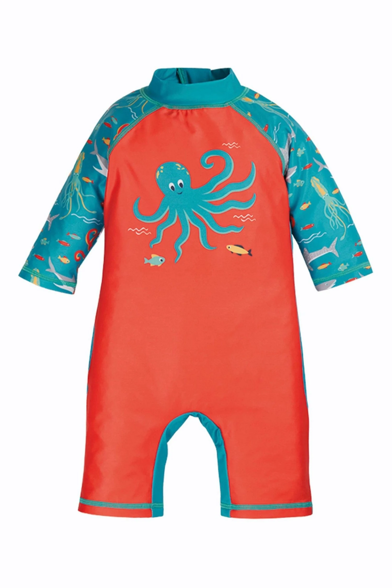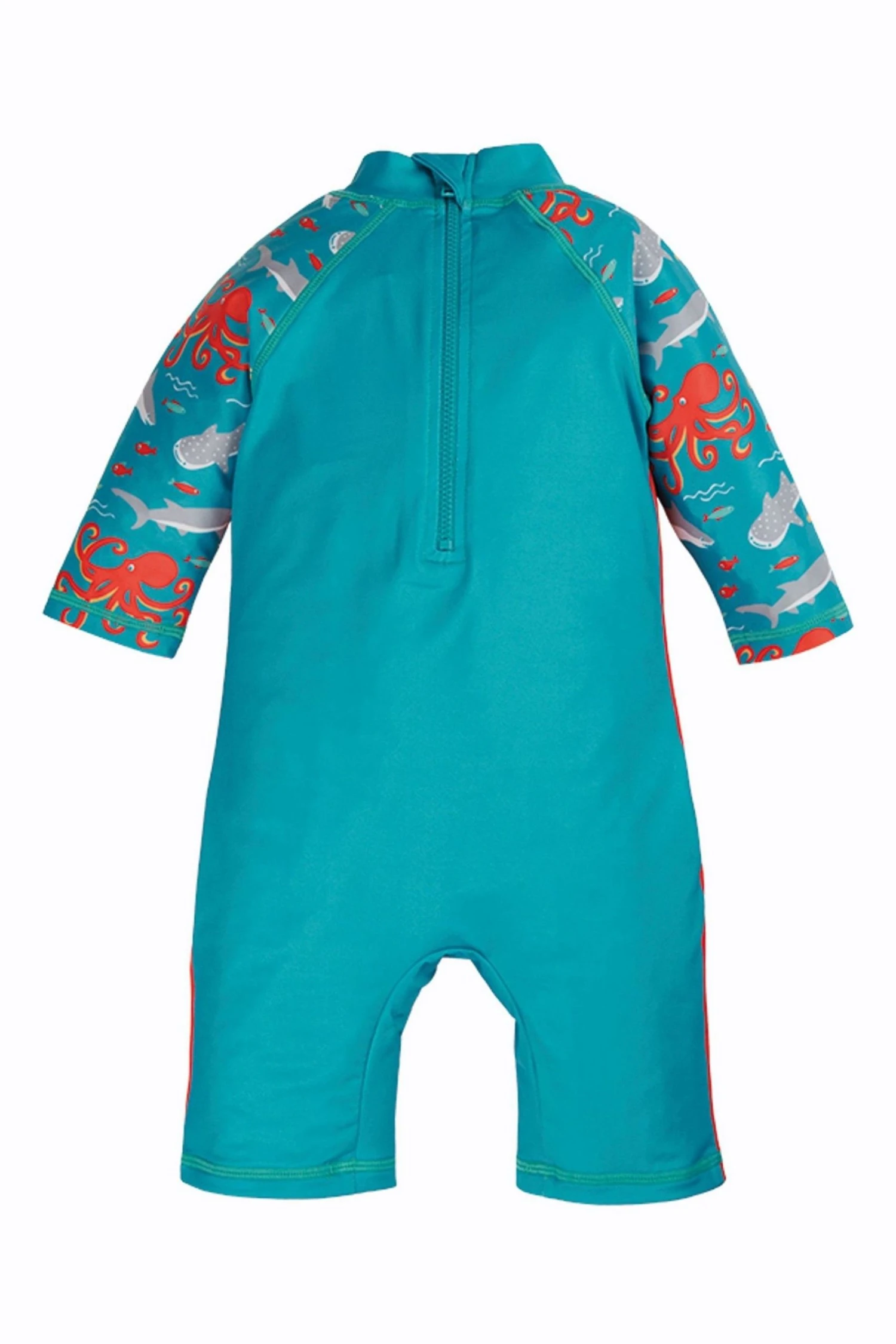 Ready for the beach, pool or surf! The Frugi sun-safe suit, passes British sun-safe standards UPF 40+. Made with recycled fabric, that meets UPF 50+. Features full zip fastening for easy peasy dressing with zip guard to protect delicate skin. Pair with a matching swim hat for ultimate sun protection.