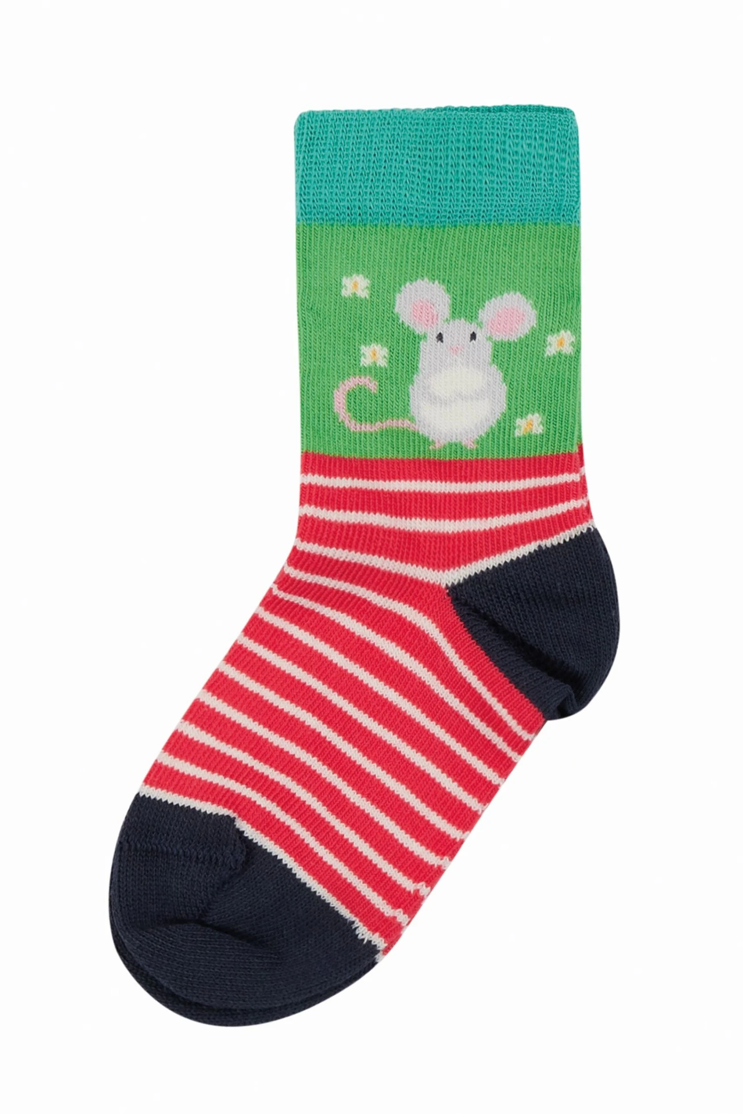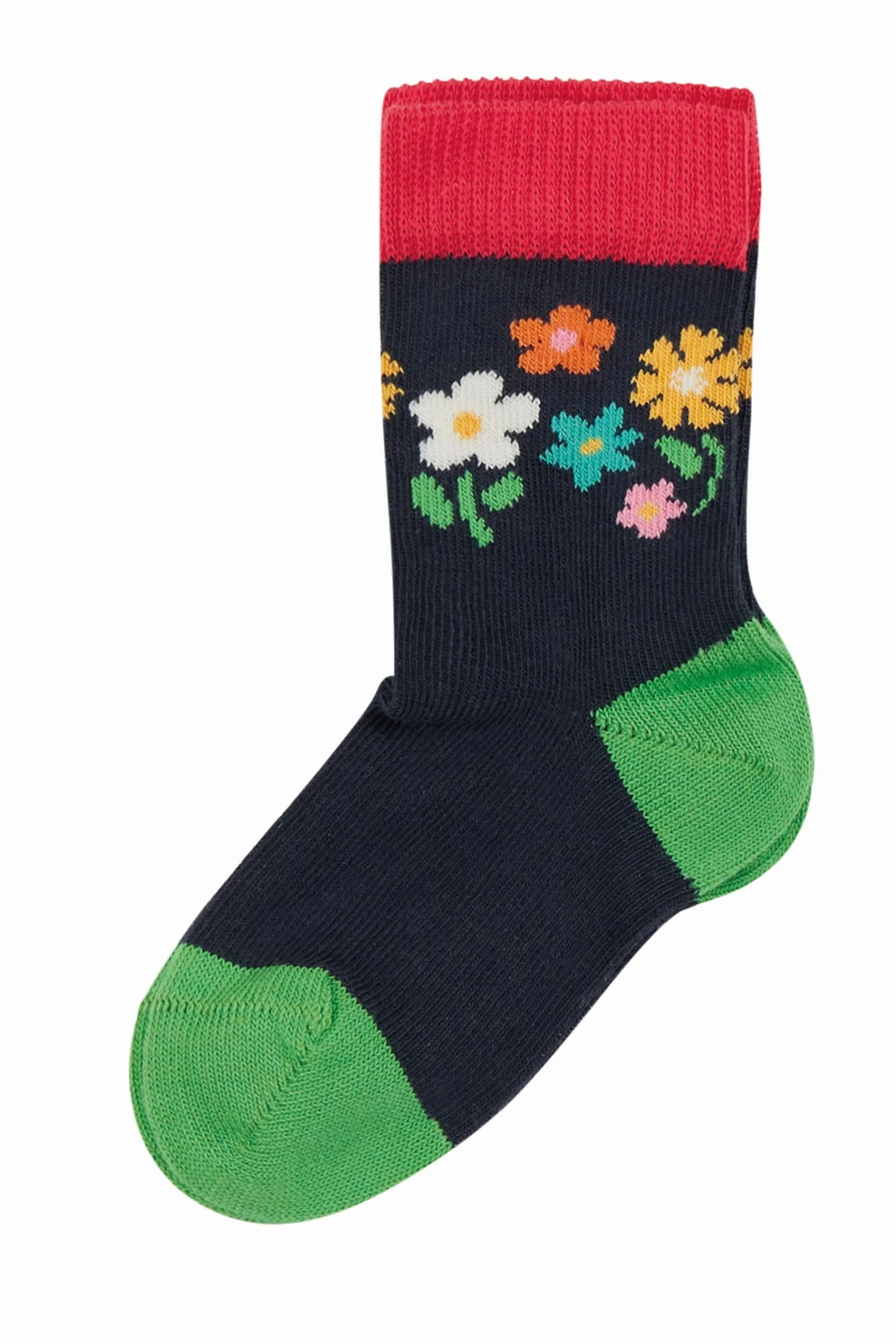 A perfect three pack of colourful socks! Featuring fun Frugi designs and a comfy rib cuff. Made from 90% Organic Cotton.