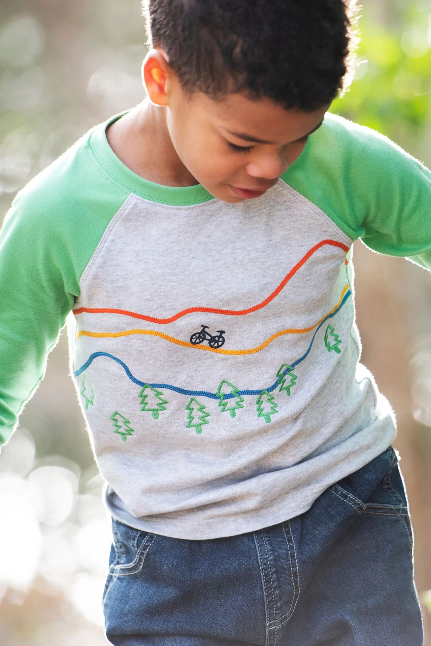 A long sleeved raglan top with mountain appliqué detail. Great to wear with so many outfits, and adds a pop of colour with the green sleeves.