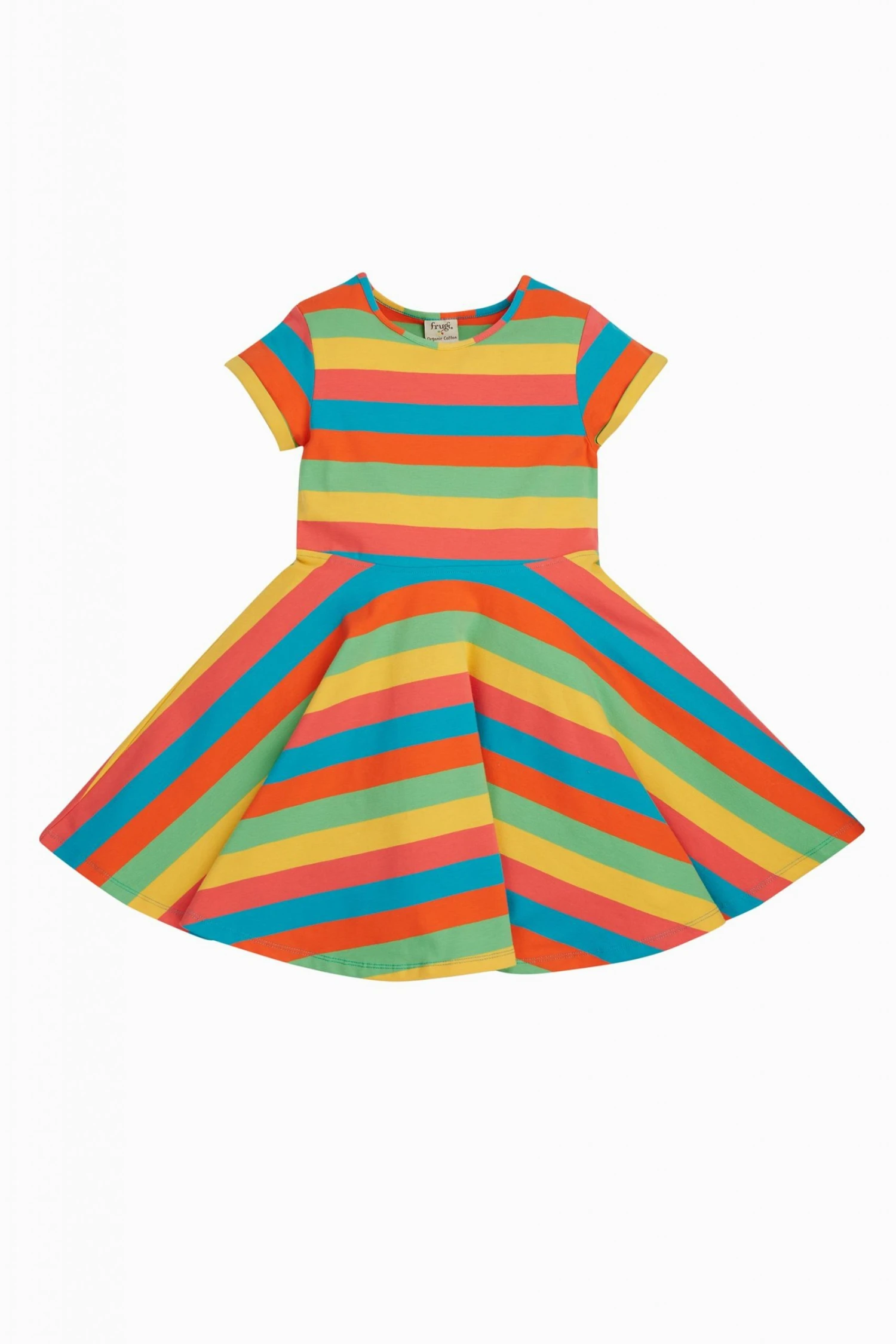 Short sleeve printed jersey dress with full 360 skirt for twirling. Made with super soft organic cotton, it’s great for all occasions. Matching headband also available for the perfect rainbow outfit!
