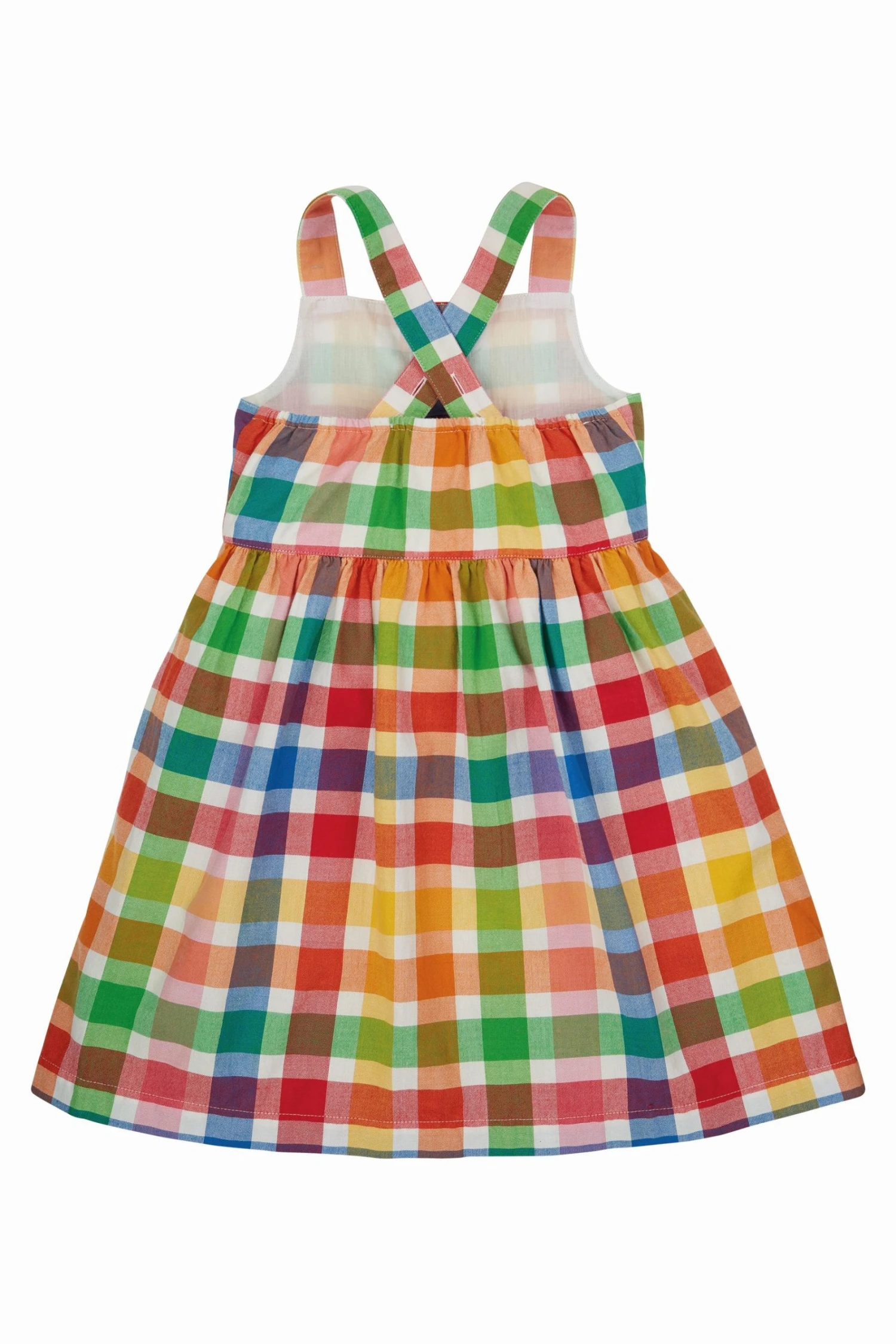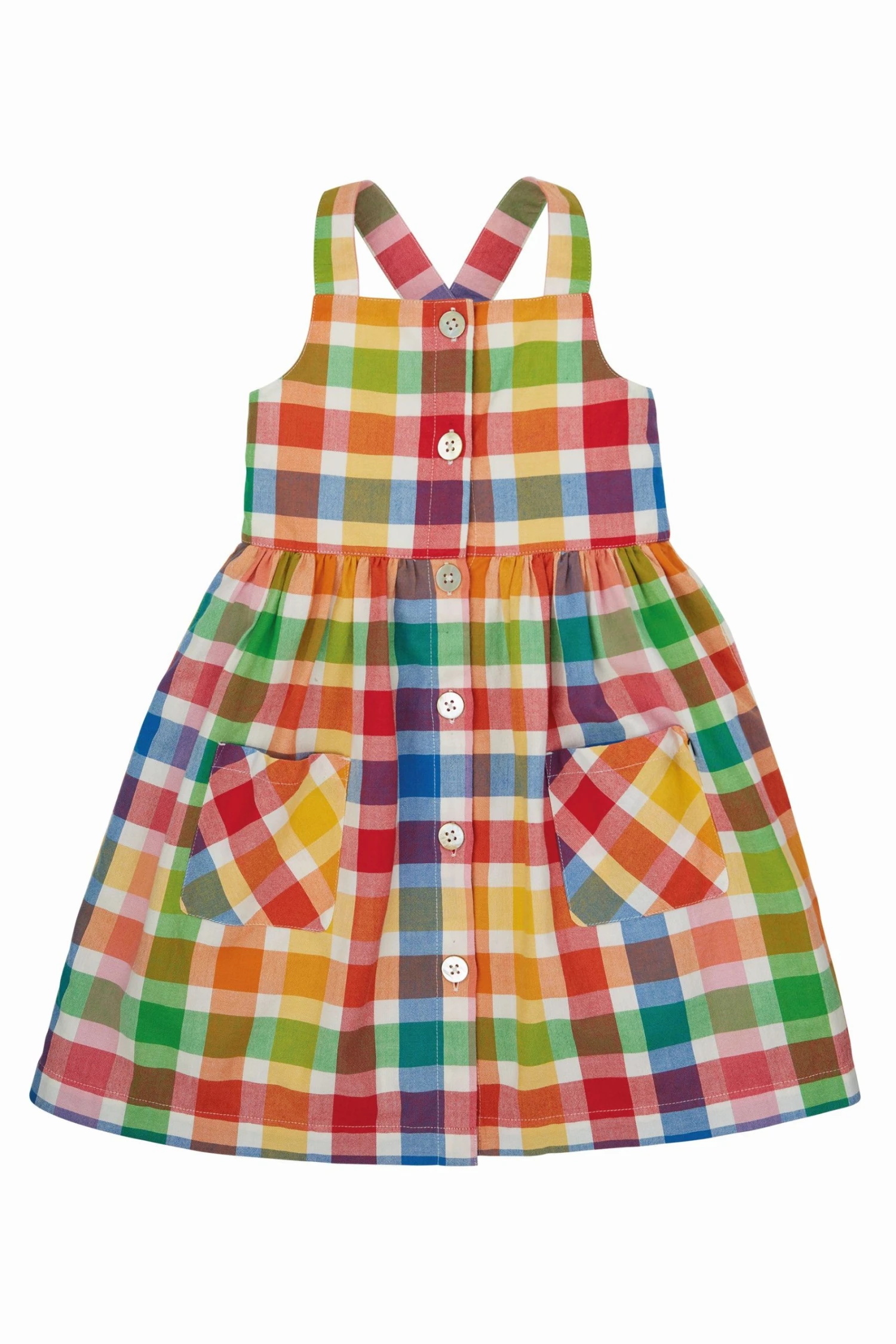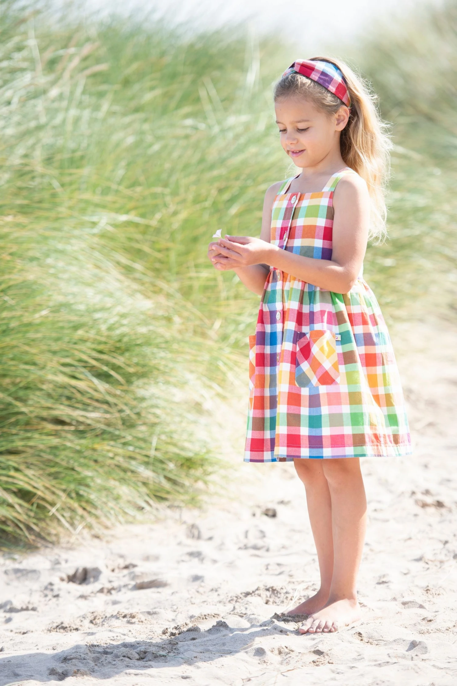 Everyone loves a pop of rainbow colour! That’s why we have used our soft woven check on the beautiful Abigail summer dress. Features cross back button adjustable shoulder straps, button up front, two patch pockets, soft gathers around front and back yoke and a soft voile lined bodice panel.