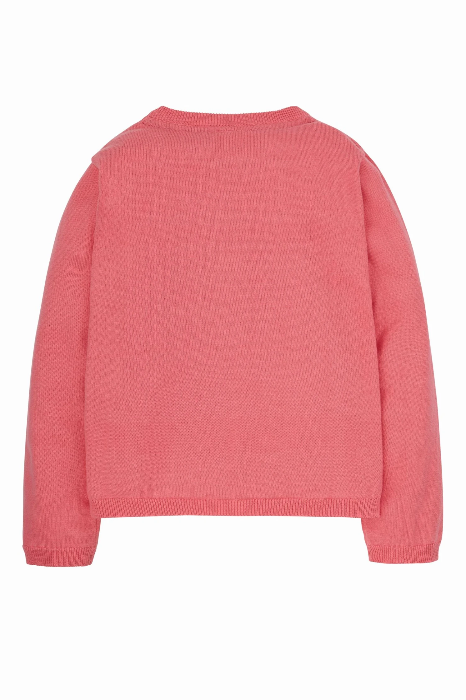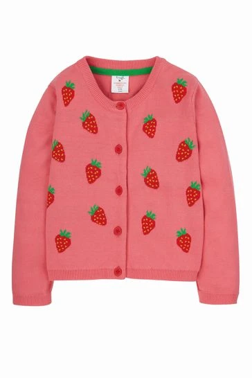 All set for summer! This beautiful fine gauge knitted cardigan features a strawberry intarsia motif design. Perfect for layering up on cooler summer days.