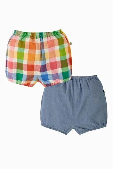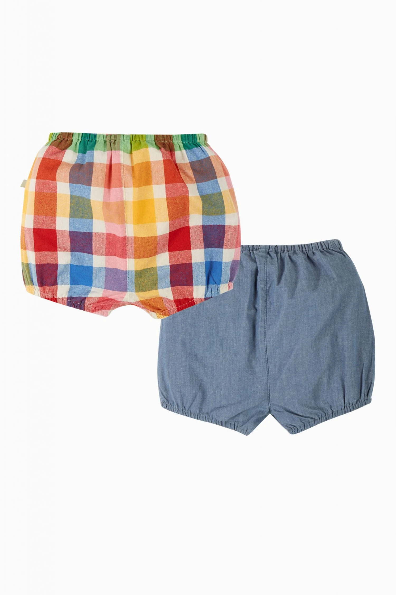 Perfect under the Frugi Sunshine Dress, this pack of two bloomers feature an elasticated waist channel and leg opening for ease of dressing and comfort. The two pack includes one chambray bloomer and one yarn dyed rainbow check bloomer.